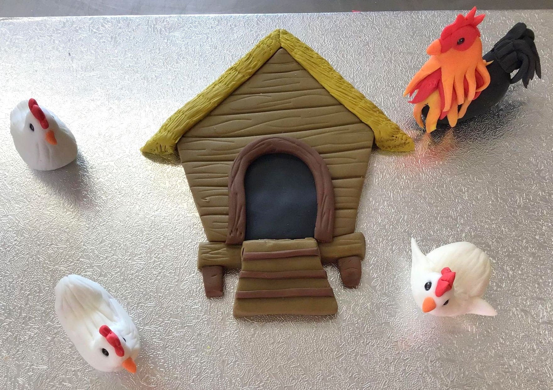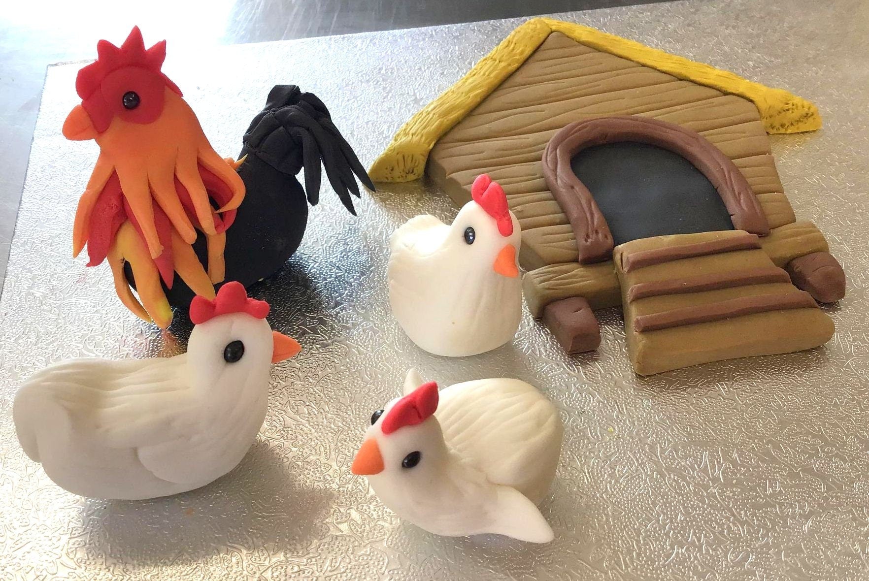 2D Chicken coop with a cockerel and 3 hens edible sugar cake topper